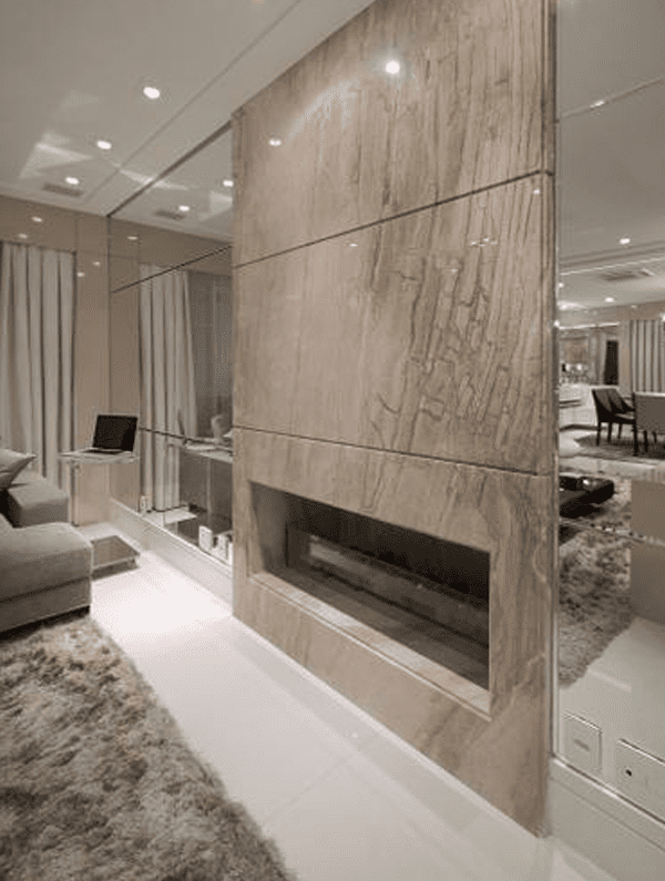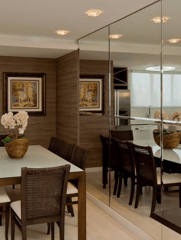 Um espelho bem aplicado, também amplia o ambiente e dá a sensação de uma profundidade maior, melhorando a iluminação por duplicar a luz existente e trazendo mais sofisticação ao ambiente chamando a atenção para pontos focais.
